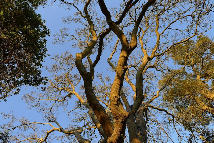 As you have seen in the recent photos I took of Big Mother Oak, she really is bare and has shriveled, pulling her energies into the root system. Then last week, I notice a humble miracle happening right in front of my bedroom cottage window. A glistening of light green, an otherworldly promise. I blink hard several times to make sure I am not still dreaming. Shiny and delicate new growth on Mama Oak's companions – really? Twice this spring? Normally they are budding with new foliage in April, and by now they are set. This year however because of the huge rains, they started sprouting in mid-February, two months early. Then in March it kept pouring and hailing on those fragile new blossoms and leaves, which were not very abundant anyway. I was concerned. Now four months later (for a second time!) a lighter shade of green leaves is filling in their canopies, giving them a subtle and vibrant two-tone look. To the untrained eye of visitors, I have to point it out. This has never happened in the 32 years I have been here. Today, I am taking delight and comfort in these unexpected magical changes happening right in front of me, shoulder to shoulder, perhaps even inside of me....